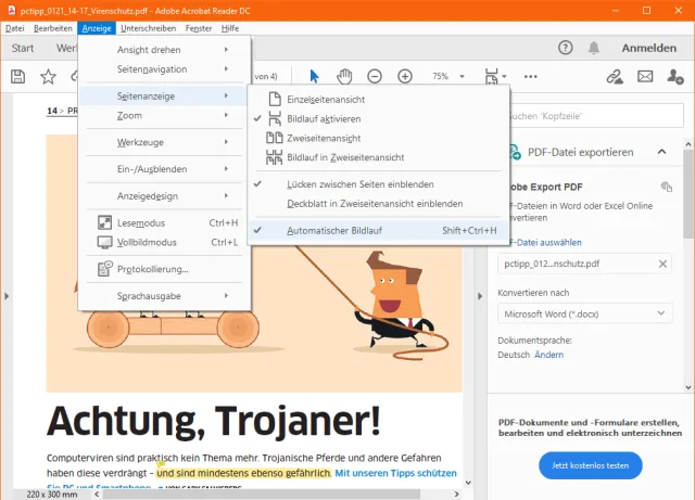 Bei längeren Dokumenten kann es auch ganz schön anstrengend sein, die ganze Zeit zu scrollen. Wenn man dann noch kein Mausrad hat, ist der Fingerkrampf sicher. Aus diesem Grund gibt es den automatischen Bildlauf. Ist dieser aktiviert, scrollt das Dokument ganz langsam, in Lesegeschwindigkeit, vor sich hin.