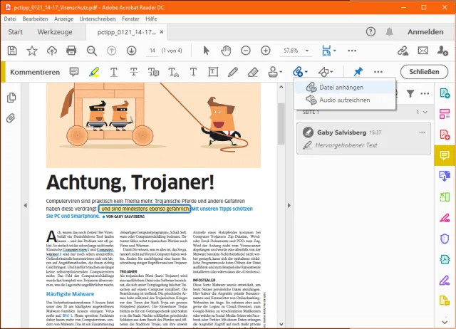 Der Acrobat Reader bietet bekanntermassen diverse Kommentar-, Markier- und Gestaltungsoptionen. Allerdings gibt es auch die Möglichkeit, Dokumente an einer beliebigen Stelle im Dokument anzuhängen, beispielsweise Bilder oder Word-Files. Gerade bei gemeinsam genutzten PDF-Dokumenten kann dies hilfreich sein.