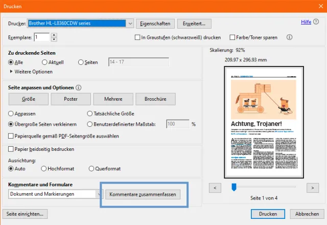Bekanntermassen kann man eine PDF-Datei, beispielsweise mit Text, nicht so ohne Weiteres bearbeiten. Allerdings kann man Kommentare oder Markierungen hinzufügen, Text markieren etc. Allerdings werden diese Kommentare beim Ausdrucken häufig nicht mitgedruckt. Dies kann ganz einfach behoben werden.