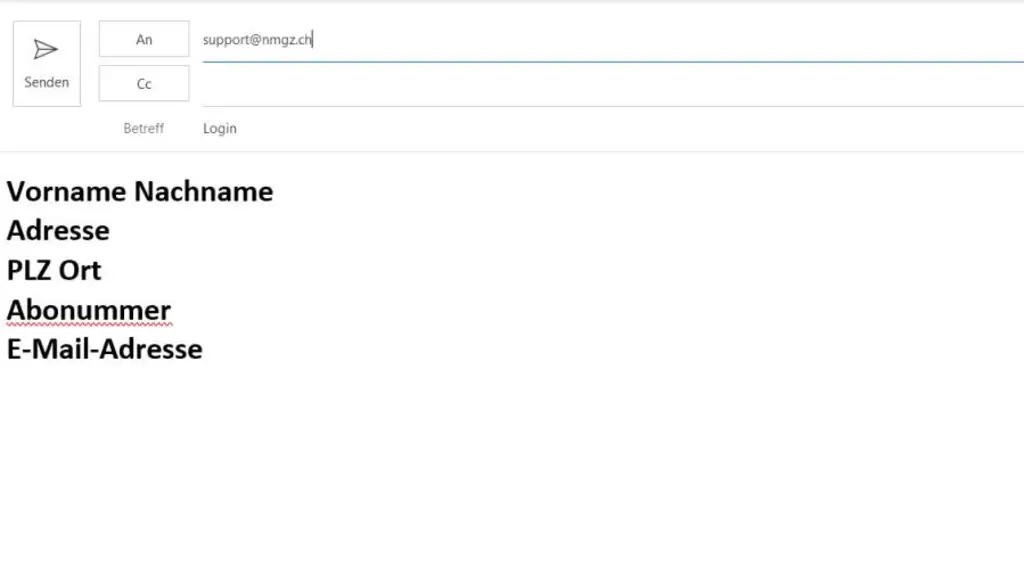 Eine E-Mail an support@nmgz.ch schreiben mit den Angaben, welche Sie im Screenshot sehen. Stellen Sie sicher, dass die E-Mail-Adresse, die Sie uns übermitteln die gleiche ist, mit der Sie sich urprünglich registriert haben