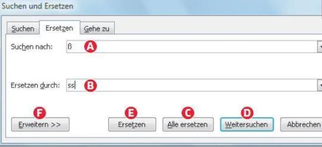 klicken Sie auf Weitersuchen (Punkt D), um zur ersten Fundstelle zu springen. Dort bestimmen Sie, ob Word Ersetzen (Punkt E) soll oder die Fundstelle auslässt und per Weitersuchen zum nächsten Fundort springt.