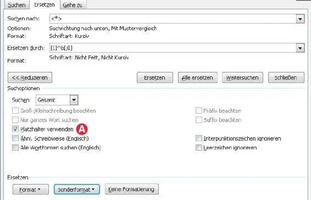 [I]Wort[/I] oder [B]Wort[/B], dass ein Wort kursiv oder fett dargestellt wird. Mit den richtigen Tricks ergänzen Sie die kursiven und fetten Textstellen in Word automatisch mit den richtigen Tags. Setzen Sie dazu den Cursor ins «Suchen nach»-Feld und aktivieren Sie unten «Platzhalter verwenden».
