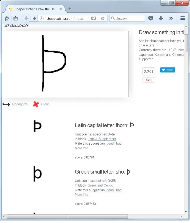 Das erkannte Zeichen können Sie entweder kopieren oder über den ANSI- oder Hexadezimalcode einfügen. Ausserdem erklärt die Seite auch, in welchem Teil des Standardzeichensatzes man es findet. Die Suchergebnisse können bewertet werden, was zu einer Verbesserung der Suchergebnisse führen kann. Aktuell stecken in der Datenbank laut Anbieter rund 10'000 Zeichen, die per Eingabeerkennung abrufbar sind.