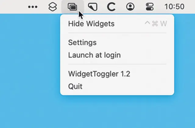 Quelle: PCtipp.chMehr Übersicht bietet die kostenfreie Anwendung WidgetToggler, die unter der Adresse go.pctipp.ch/3302 auf den Download wartet. Nach dem Start zeigt sie in der Menüleiste ein Symbol, um die Widgets mit den Befehlen Show Widgets respektive Hide Widgets ein- und auszublenden, Bild 3. Das funktioniert auch über Command+Control+W – oder über ein eigenes Kürzel, das Sie im Menü über den Befehl Settings festlegen.