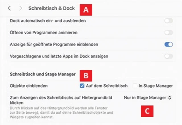 Quelle: PCtipp.chAlso weg damit. Öffnen Sie die Systemeinstellung Schreibtisch & Dock, Bild 1 A. Blättern Sie nach unten zum Bereich Schreibtisch und Stage Manager B und wählen Sie im Einblendmenü Zum Anzeigen des Schreibtischs auf Hintergrundbild klicken, die Option Nur in Stage Manager C. Der graue Rahmen, Bild 2 A, ist jetzt Geschichte.