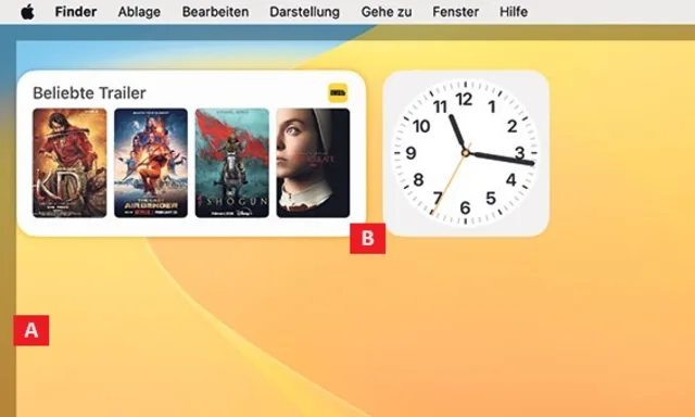 Als deutlich nützlicher erweisen sich die «Widgets»: dekorative Mini-Anwendungen, die sich unter macOS 14 auf dem Schreibtisch frei anordnen lassen B.Widgets platzieren