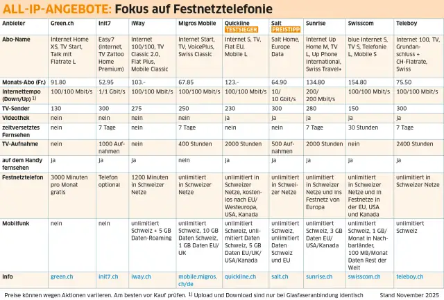 Der PCtipp gibt für jeden der neun geprüften Anbieter einen Überblick über dessen All-in-one-Pakete. In den Tabellen haben wir für jeden Anbieter das aus unserer Sicht beste Angebot mit Fokus auf «Festnetztelefonie», «Mobilfunk», «Internet» und «TV» erstellt.Green.ch