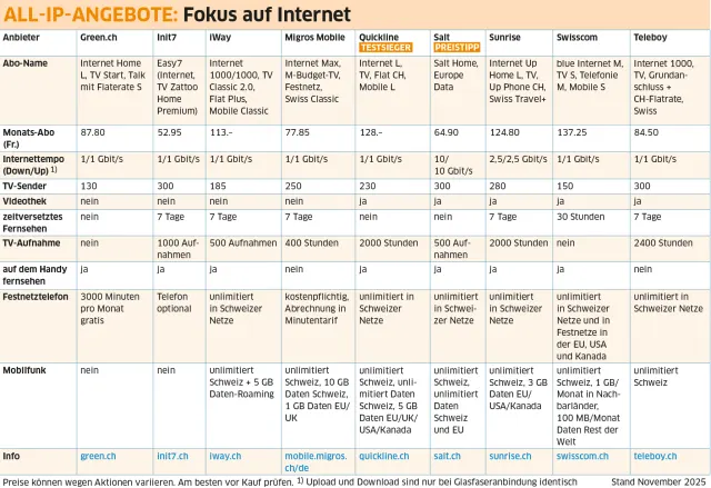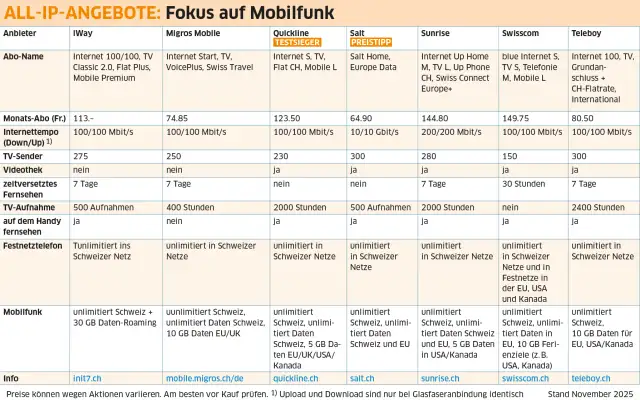 Bis auf Green.ch und Init7 bieten alle geprüften Provider Quad-Play-Angebote, bestehend aus Internet, TV, Festnetz und Mobilfunk. Die Mobilfunkpakete starten meist mit einem Basis-Abo, das unlimitierte Anrufe und SMS innerhalb der Schweiz sowie ein festes Datenvolumen umfasst. Hochwertigere Tarife beinhalten unlimitierten Datenverkehr und schliessen oft ein Datenkontingent für Roaming im europäischen oder interkontinentalen Ausland mit ein. Teils lassen sich auch Datenpakete für Auslandsaufenthalte kaufen.