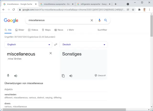 Quelle: PCtipp.chManchmal erscheint danach ein Symbol Aussprache lernen. Nach dem Klick auf dieses oder wenn Sie direkt z.B. nach miscellaneous Aussprache gesucht haben, erscheint ein erweitertes Aussprache-Element. Hier lässt sich nun umschalten zwischen amerikanischem und britischem Englisch. Sie finden hier sogar den Schalter Langsamer für besonders knifflige Wörter.