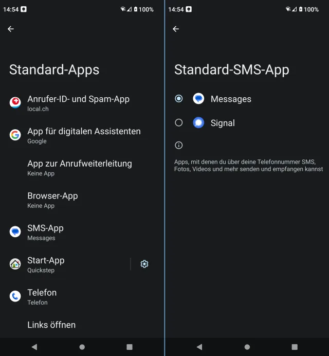 Es gibt systemnahe Apps, von denen auf den meisten Android-Geräten mindestens eine installiert ist. Das betrifft Apps, die Ihnen anzeigen, wer anruft (Anrufer-ID-App), die Wahl des digitalen Assistenten (sofern Sie einen nutzen), für die Anrufweiterleitung, die Browser-App (nur Wechsel), die SMS-App, den Launcher (Start-App) und die standardmässig zu verwendende Telefon-App.So gehts: Öffnen Sie die Einstellungen-App und gehen Sie darin zu Apps/Standard-Apps. Hier finden Sie die App-Kategorien aufgelistet, für die Sie eine andere als Standard festlegen. Tippen Sie etwa die SMS-App an, können Sie auf eine andere App umschalten, sofern eine weitere installiert ist, die mit SMS etwas anfangen kann.