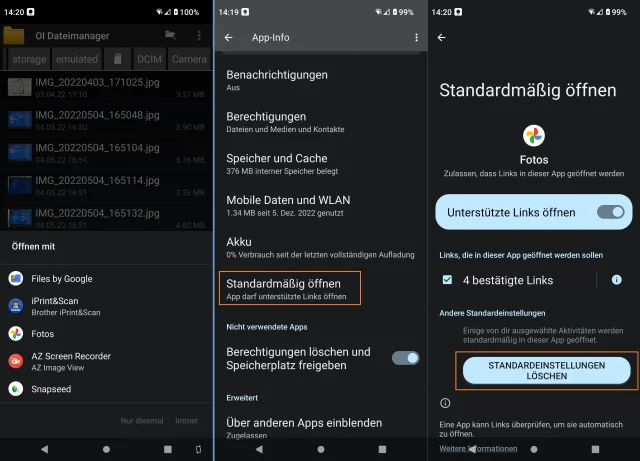 Wenn die Frage (links), mit welcher App z. B. Bilder zu öffnen sind, nicht mehr erscheint, entziehen Sie der App, die sich hierfür vordrängelt, die Einstellung als Standard-App