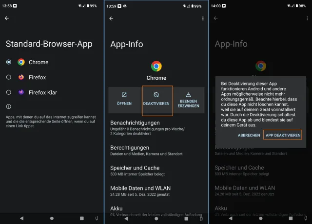Setzen Sie Chrome als Standardbrowser, wie in Variante 1 gezeigt. Gehen Sie via Einstellungen/Apps zu Chrome und wählen Sie hier Deaktivieren. Bestätigen Sie die Rückfrage, z. B. mit App deaktivieren.