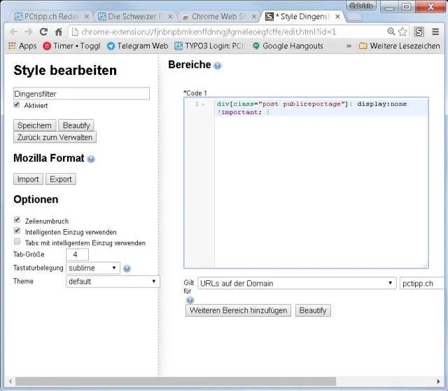 Nach der Installation erscheint in Chrome oben ein S-Symbol. Besuchen Sie die betroffene Webseite. Klappen Sie das S-Symbol aus und klicken Sie bei «Style erstellen für» auf den Domainnamen. Geben Sie einen beliebigen Namen für den Filter ein, zum Beispiel XYFilter. Achten Sie darauf, dass die Option darunter aktiviert ist.