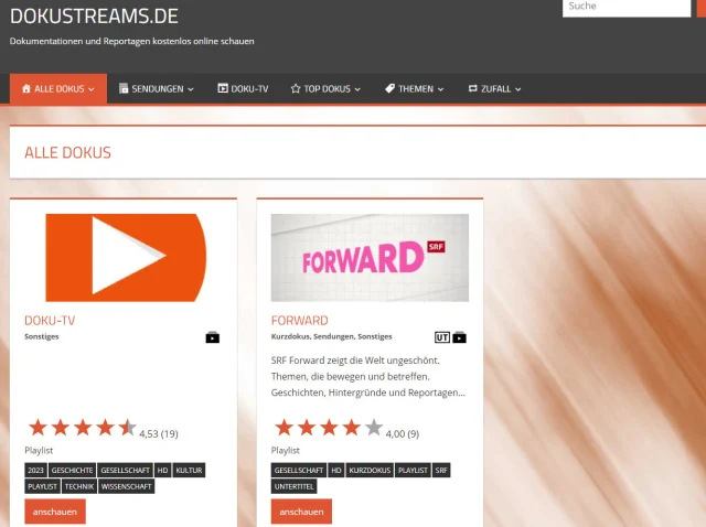Quelle: PCtipp.chDokustreams (dokustreams.de) ist eine private Webseite, die Dokumentationen sowie Reportagen aus dem deutschsprachigen Raum frei zugänglich macht. Hier ist es besonders einfach, Sendungen der deutschsprachigen öffentlich-rechtlichen Anstalten zu finden, um sich zu einem bestimmten Thema zu informieren, Bild 6.