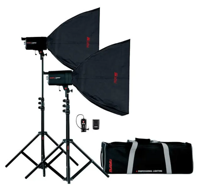 Im verwendeten Einsteigerset von Multiblitz sind nicht alle vorhin erwähnten Teile enthalten. Das Set besteht zur Hauptsache aus zwei Blitzern (Modell Compact Plus) mit je einer dazu passenden Softbox und dreibeinigem Stativ. Die Softbox wird wie ein Camping-Zelt aufgebaut und dann an das Blitzgerät geschraubt. Vorne lässt sich ein weisses Tuch per Klettverschluss vorspannen, um den Schattenwurf abzudämpfen. Zusätzlich kann im Inneren der Softbox ein kleineres, zweites Tuch montiert werden, um noch weicheres Licht zu erzeugen.