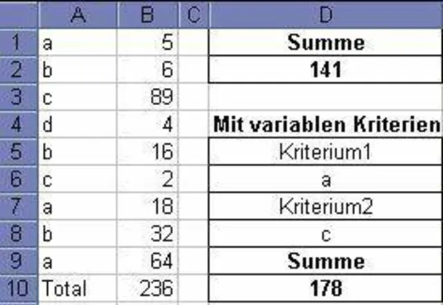 Ich versuche aus einer Reihe von Zahlen die Summe zu ermitteln, in deren Nebenzelle entweder der Buchstabe a oder b steht. Alle anderen Zahlen dürfen nicht dazugezählt werden. Ich habe versucht die Funktion SUMMEWENN mit der Funktion ODER zu verknüpfen um mehrere Bedingungen eingeben zu können. Leider klappt das aber einfach nicht. Wie kann ich diese Summe ermitteln?