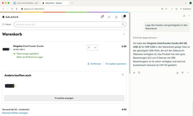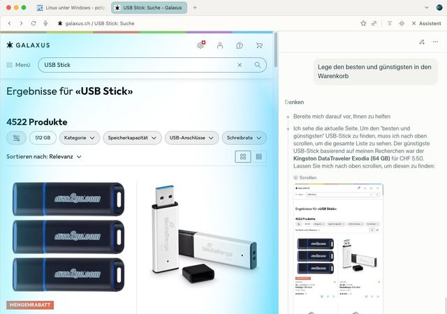 Nach der Anmeldung steht der KI-Agent bereit. Sie können ihm Aufgaben stellen, die er abarbeitet. Dabei dürfen Sie ihm in der Seitenleiste bei seinem «Denkprozess» zusehen, Bild 9. Beim Test auf einer Shopping-Seite stellte er etwa eine Liste günstiger USB-Sticks zusammen, die gerade im Angebot waren, und legte anschliessend den «günstigsten und besten» in den Warenkorb, Bild 10. Wenn Sie Ihre Zahlungsdaten in den Einstellungen des Browsers hinterlegen, führt Comet die Bestellung anschliessend in Ihrem Auftrag durch. Allerdings will das nicht jeder E-Commerce-Anbieter. So hat Amazon bereits eine Warnung an Perplexity geschickt, dass Comet keine Aktionen mehr auf den Webseiten des Konzerns durchführen soll, da dies den Nutzungsbedingungen widerspreche.