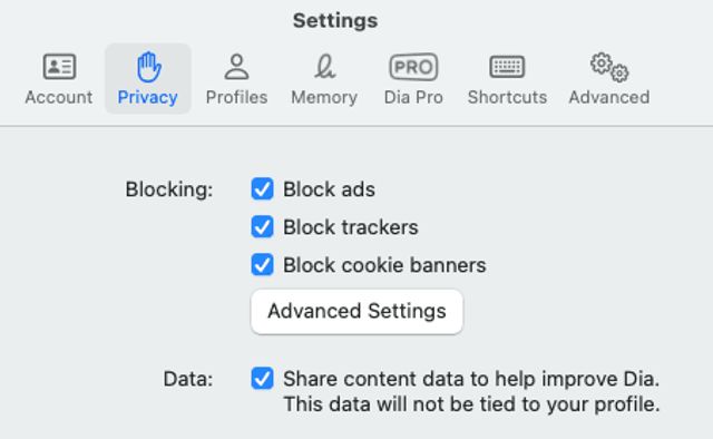 Andere Skills fassen die letzten 24 Stunden zusammen, die man mit Arbeit im Browser verbracht hat, oder analysieren Webseiten und geben Tipps dazu, wie man es besser machen könnte, Bild 11. Anwender können auch eigene Skills erstellen und einreichen. Ferner enthält Dia einen Werbe- und Tracking-Blocker, Bild 12. Wer den Browser unterstützen oder mehr Gratis-Chats pro Stunde haben will (wie viele es genau sind, wird flexibel gehandhabt), der kann eine Pro-Version für 20 US-Dollar im Monat erwerben.