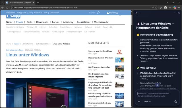 Bild 3: Die KI in Microsoft Edge kann auf den daneben geöffneten Reiter zugreifen und die Inhalte einer Webseite zusammenfassen