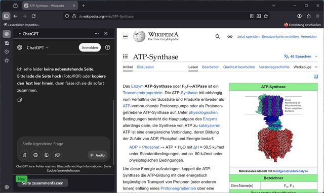 Bild 6: Über die Firefox-Schaltfläche unten links erhält hier ChatGPT Zugriff auf die aktuell besuchte Seite