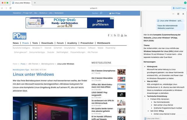 Bild 8: In der Seitenleiste von ChatGPT Atlas können Sie Fragen zur aktuell besuchten Webseite stellen