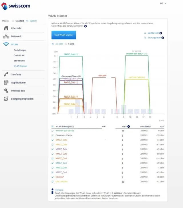 Quelle: PCtipp.chProbleme mit der Surf-Geschwindigkeit können viele Gründe haben. Die wichtigsten davon finden Sie hier. Was die Internet-Box 2 anbietet, ist ein Scanner, der sämtliche WLAN-Netze in der Umgebung abscannt und überprüft, ob diese eventuell mit Ihrem Netz in Konflikt stehen. Dies stellt die Box mit einer farbigen Grafik dar. Diese Funktion finden Sie unter WLAN/WLAN Scanner. Ebenfalls können sich zu viele gleichzeitige Aktivitäten negativ auf die Leistung auswirken. Überprüfen Sie unter Netzwerk/Geräteliste, wie viele Geräte aktuell mit der Internet-Box 2 verbunden sind.
