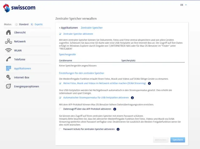 Quelle: PCtipp.chDie Internet-Box 2 bietet die Möglichkeit, zentral auf Daten zuzugreifen. Sie können also beispielsweise eine externe Festplatte an der Box anschliessen und somit von jedem mit dem WLAN verbundenen Gerät auf die Inhalte der Festplatte zugreifen (oder auf diejenigen eines anderen USB-Speichergeräts). Dazu schliessen Sie das USB-Gerät an die Box an und aktivieren den Punkt Zentraler Speicher aktivieren (mit einem Häkchen). Diesen Punkt finden Sie unter Applikationen/Zentraler Speicher verwalten. Um Musik, Videos und sonstige mediale Inhalte über die Box sichtbar zu machen (und zu hören oder anzuschauen etc.), aktivieren Sie auch den Punkt Meine Fotos, Musik und Videos im Netzwerk sichtbar machen (DLNA Streaming). Aufgerufen werden kann dieser Speicher, indem Sie im Windows-Explorer den Pfad \\INTERNETBOX-NAS eingeben. Bedenken Sie, dass der Zugriff grundsätzlich jedem Gerät im Netzwerk möglich ist. Wollen Sie das beschränken, aktivieren Sie im gleichen Menü den Punkt Passwort-Schutz für zentralen Speicher aktivieren und legen Sie ein Passwort fest.