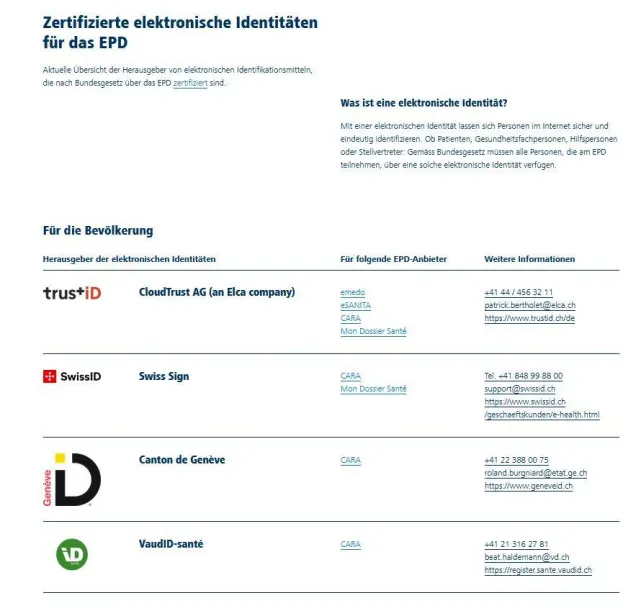 Das sind laut der EPD-Webseite patientendossier.ch die zertifizierten elektronischen Identitäten für das EPD: