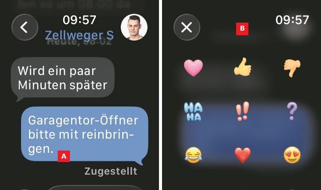 Oft reicht jedoch ein Emoji. Drücken Sie etwas länger auf die Nachricht A und wählen Sie das gewünschte Bildchen B. Dieses erzeugt seinerseits keine neue Nachricht, sondern wird einfach an die Sprechblase angehängt.