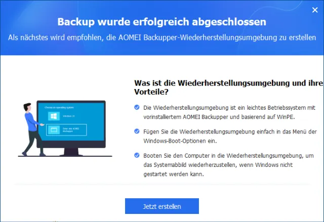 Quelle: PCtipp.chEs dauert ein Weilchen, bis das Werkzeug die Wiederherstellungsumgebung heruntergeladen und auf den USB-Stick geschrieben hat. Zum Schluss wirbt der Aomei Backupper nochmals für die Wiederherstellungsumgebung, die nur in der kostenpflichtigen Version enthalten ist. Klicken Sie das Werbefenster über das kleine X oben rechts weg.