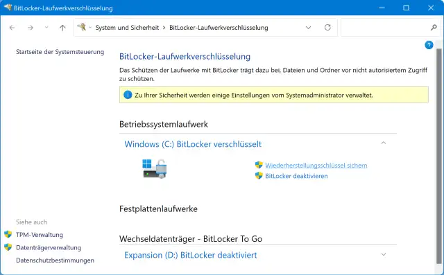 Die Pro-Versionen von Windows 10 und 11 enthalten (im Gegensatz zu Home) auch die Bitlocker-Laufwerksverschlüsselung. Sie ist nicht bei allen Geräten ab Werk eingeschaltet. Prüfen Sie es, indem Sie auf das Menü Start klicken, Bitlocker eintippen und Bitlocker verwalten öffnen.Falls diese Verschlüsselung bei Ihnen aktiviert ist, dient sie dazu, die Inhalte der Festplatte zu schützen, wenn das Gerät gestohlen wird oder eine neugierige Person sich daran zu schaffen machen will. Die Verschlüsselung verhindert zuverlässig den Zugriff auf die Festplatteninhalte, auch wenn jemand den Rechner etwa mit einem Windows-Wiederherstellungs- oder Linux-Datenträger aufstartet. Ohne Eingabe des Bitlocker-Schlüssels gibts keinen Zugriff.