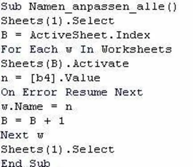 Einen Fehler, zum Beispiel wenn die Zelle B4 leer ist oder bereits ein Blatt mit dem selben Namen besteht, wird das Makro einfach übergehen, und den Namen dieses Blattes nicht ändern. Sie können das Makro also auch ausführen, wenn Sie nur den Namen eines einzelnen Blattes geändert haben.