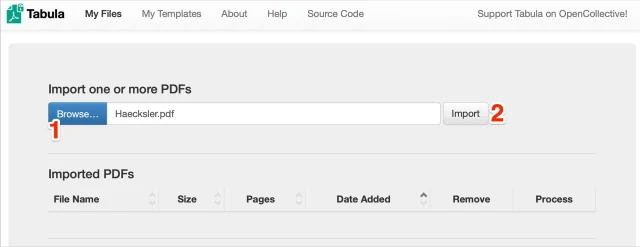Laden und starten Sie Tabula. Es öffnet sich ein Fenster im Standard-Browser, in diesem Fall Safari am Mac.Wählen Sie das PDF mit einem Klick auf die Schaltfläche «Browse» (1) aus. Je nach Komplexität und Grösse des PDFs kann das einen Moment dauern. Klicken Sie auf die Schaltfläche «Import» (2) um den Inhalt der Datei anzuzeigen.