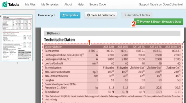 Markieren Sie die Tabelle(n), indem Sie mit der Maus ein Rechteck darüber ziehen (1) und klicken Sie auf die Schaltfläche «Preview & Export Extracted Data». (2)