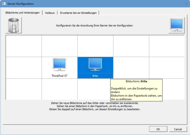 Quelle: PCtipp.chAuf dem Server klicken Sie zudem auf Server konfigurieren. Es erscheint ein Gitternetz, auf dem das Symbol für den Server-Bildschirm (hier ThinkPad-07) schon platziert ist. Ziehen Sie aus der oberen rechten Ecke das Bildschirmsymbol und platzieren Sie es links oder rechts des Server-Bildschirms, je nachdem, welcher davon auf Ihrem Schreibtisch links oder rechts steht. Klicken Sie doppelt darauf und legen Sie für den Bildschirmnamen den Hostnamen des Clientgerätes fest (unseres heisst ifritx).