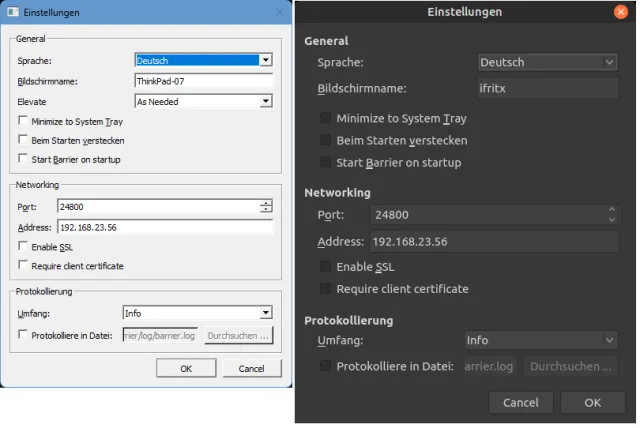 Die Einstellungen des Servers (Windows, links) und Clinets (Linux, rechts)