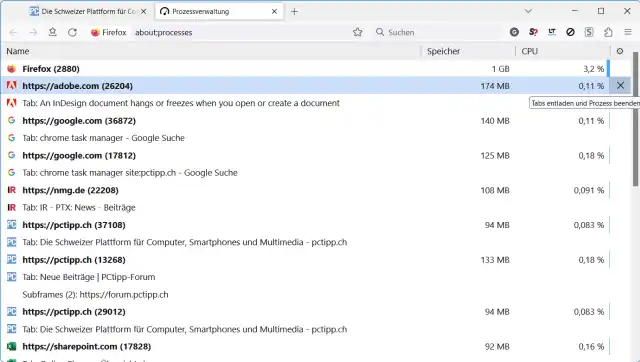 Drücken Sie einfach das Tastenkürzel Shift+Esc (Umschalt+Esc), schon öffnet sich im Firefox ein neues Tab respektive in Chrome ein neues Fenster, das die Browser-Tasks zeigt. Soll ein Task geschlossen werden, versuchen Sie möglichst zuerst einfach das Tab zu schliessen, falls Sie es lokalisieren können. Ein Task lässt sich aber auch beenden, indem Sie im Firefox über den Task fahren und zuhinterst aufs X klicken. In Chrome klicken Sie den Task an und wählen unten Prozess beenden.