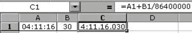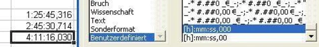 In Zelle A1 steht die Zeit im Format [h]:mm:ss, in Zelle B1 stehen die Tausendstel als normale Zahl. In Zelle C1 schliesslich werden beide addiert - und Excel stellt das Zahlenformat [h]:mm:ss.000 korrekt dar. Mit der Zahl in C1 können dann weitere Berechnungen durchgeführt werden.