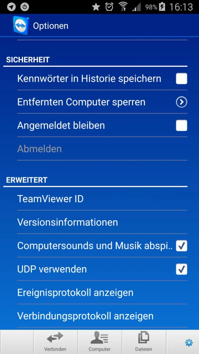 Lösung: Starten Sie TeamViewer auf dem Tablet oder Smartphone. Bevor Sie sich verbinden, öffnen Sie übers Zahnradsymbol die Optionen. Im Bereich «Erweitert» entfernen Sie das Häkchen bei «Computersounds und Musik abspielen».