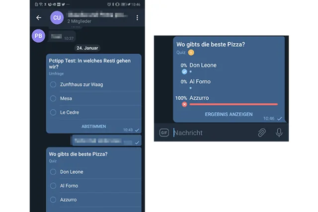Mit der neusten Version des Messengers Telegram können Sie neu verschiedene Arten von Umfragen sowie ein Quiz erstellen und verschicken. Nun sind Umfragen nicht mehr nur anonym – man kann also sehen, wer aus dem Freundeskreis für den Besuch der lausigen Pizzeria gestimmt hat. Ausserdem sind Mehrfachantworten möglich und Teilnehmer können versuchen, in einem Quiz die richtige Antwort zu erraten.Wählen Sie eine Telegram-Gruppe aus.