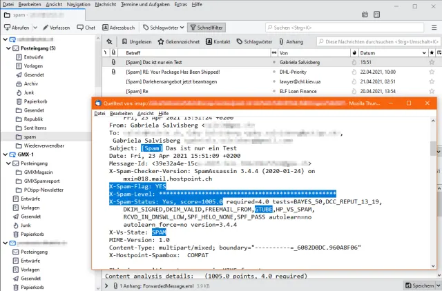 Quelle: PCtipp.chSenden Sie die Mail ab und holen Sie im Empfängerkonto die neuen Mails ab. Wurde sie als Spam markiert? In unserem Test klappte es. Wie die Kopfzeilen (in Mozilla Thunderbird mit Ctrl+U bzw. Strg+U anzeigbar) enthüllen, erhielt die Mail über 1000 Spam-Punkte und wurde damit tüchtig als Spam abgewatscht.