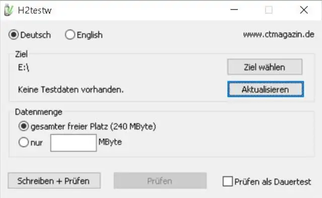 Dieses Tool ist in Deutsch und Englisch. Laden Sie es von der Heise-Webseite herunter und entzippen Sie es in einen Ordner. Öffnen Sie den Ordner und starten Sie das Programm h2testw.exe.