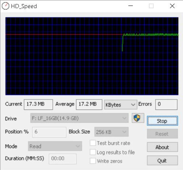 Wählen Sie unter «Drive» den USB-Stick aus. Falls er nicht angezeigt wird, hilft ein Klick auf Reset. Unter «Block Size» stellen Sie die Grösse der Testdaten ein, mit denen HD_Speed arbeitet. Übernehmen Sie «Auto». Das Tool prüft Lesegeschwindigkeit und Schreibgeschwindigkeit getrennt. Führen Sie den Test darum je einmal mit «Read» und «Write» durch. Stellen Sie unter «Duration» entweder die Testdauer ein oder warten Sie, bis der Punkt «Position» mindestens einmal 100 Prozent erreicht hat.