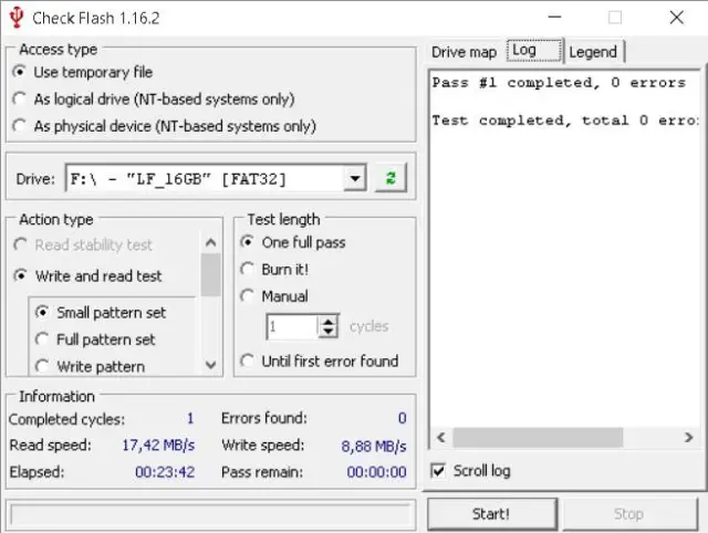 Quelle: PCtipp.chLangzeittester wählen «Burn it!» (wovon wir abraten) und stoppen die Prüfung nach einer Weile manuell. Alternativ geben Sie die Anzahl der Testläufe unter dem Punkt «Manual» selbst ein. Wer sich nur für Fehler interessiert, wählt die letzte Option «Until first error found». Im Bereich «Action type» greifen Sie zur Einstellung «Small pattern set». Wer unter «Access type» die zweite oder dritte Option wählt, hat bei «Action type» mehr Auswahl. «Full erase» löscht etwa den Inhalt des Datenträgers, «Read stability test» liest hingegen die Testdaten des USB-Sticks mehrfach.