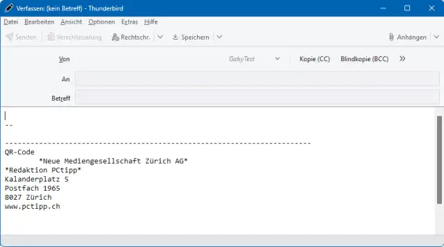 Schritt 5: Fertig mit dem Gestalten? Öffnen Sie das Menü Datei/Speichern als/Datei. Als Dateiname wählen Sie z.B. signatur.html und als Speicherort jenen Ordner, in dem auch die verwendete Bilddatei (Ihr Logo oder QR-Code) liegt. Bei uns heisst die Datei «BeispielSignaturThunderbird.html».Die angefangene E-Mail haben Sie nur benutzt, um den Thunderbird-eigenen HTML-Editor zu verwenden. Da Sie die damit erstellte Signatur gespeichert haben, können Sie die Mail für spätere Anpassungen via Datei als Entwurf speichern oder auch einfach schliessen und verwerfen.