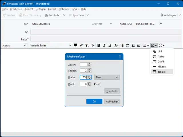 Schritt 3: Falls Sie Text und Logo kombinieren wollen, verwenden Sie eine Tabelle mit einer Zeile und zwei Spalten. Hinter dem Bildchen-Symbol befinden sich die dazu notwendigen Werkzeuge, hier rechts im Screenshot. Im kleinen Fenster für die Tabelleneinstellung verwenden Sie 1 Zeilen und 2 Spalten. Empfehlung: Setzen Sie die Breite nicht in Prozent, sondern in Pixel. Ein Wert von 600 Pixel dürfte auf den meisten Geräten gut kommen. Setzen Sie den Rand auf 0 (Null).