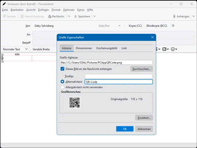Schritt 1: Verfassen Sie im Thunderbird eine neue E-Mail im HTML-Format. Stellen Sie sicher, dass unter Optionen/E-Mail-Format/Nur HTML gewählt ist. Leeren Sie die Mail, falls eine bereits vorhandene Signatur schon Inhalte platziert hätte.Schritt 2: Legen Sie z. B. in Ihrem Eigene-Dateien-Ordner eine Bilddatei im Format PNG bereit. Achten Sie darauf, dass sie im Original nicht grösser ist, als sie angezeigt werden soll. Die Bilddatei wird nämlich mit jeder Mail mitgeschickt; und Sie möchten bestimmt nicht mit Megabyte-grossen Bilddateien die Postfächer Ihrer Bekannten oder Kunden verstopfen. Unsere Beispielgrafik ist ein QR-Code mit 116×116 Pixel.