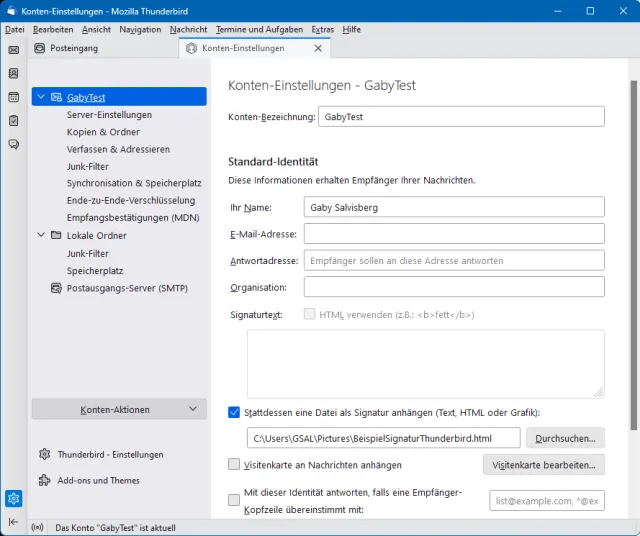 Schritt 6: Jetzt binden Sie die Signaturdatei ein: Öffnen Sie das Menü Extras/Konten-Einstellungen oder klicken Sie in der linken Spalte mit rechts auf die Kontenbezeichnung, gefolgt von Einstellungen. Falls Sie mehrere Konten haben, klicken Sie jetzt direkt auf den Konto-Namen, in dem Sie Ihre neue Signatur verwenden wollen. Setzen Sie bei Stattdessen eine Datei als Signatur anhängen ein Häkchen und klicken Sie dahinter auf Durchsuchen. Wählen Sie Ihre vorhin gespeicherte Signatur.html-Datei aus.