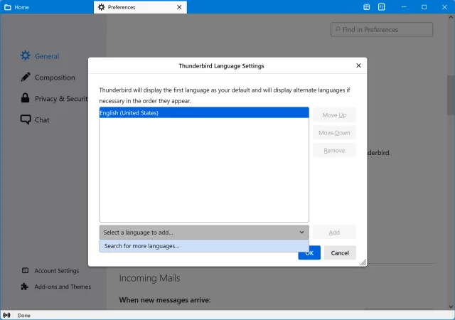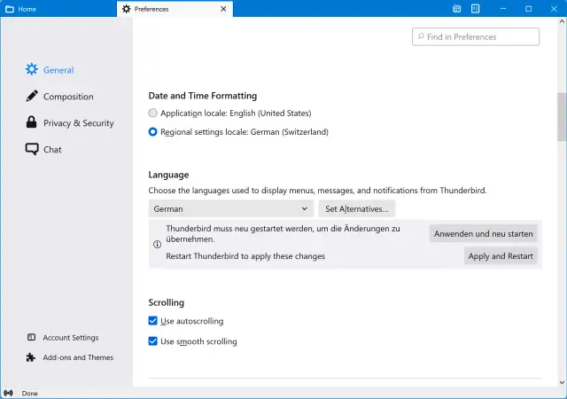 Quelle: PCtipp.chHinweis: Anders als bei der Rechtschreibprüfung (siehe «Thunderbird: Rechtschreibprüfung in Deutsch hinzufügen») gibt es für die Darstellung der Bedienoberfläche keine verschiedenen Sprachvarianten für «Deutsch (Schweiz)» oder «Deutsch (Österreich)».