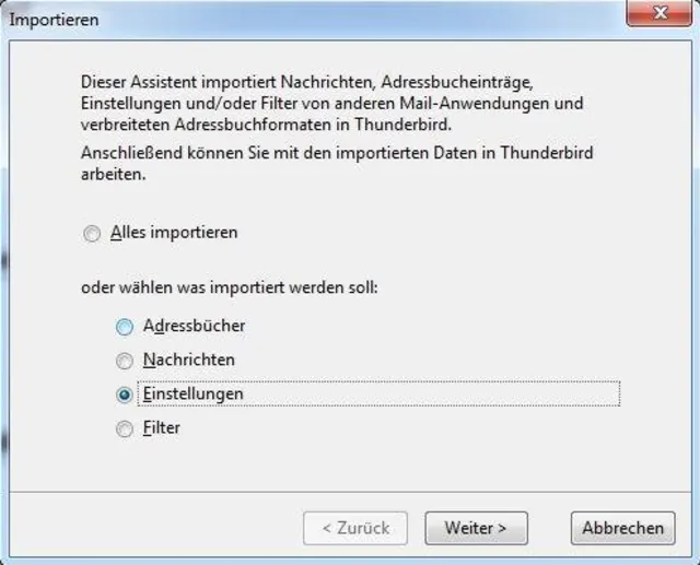 Auch beim ersten Start bietet Thunderbird an, ihn zum Standard-Mailprogramm zu machen. Klicken Sie hier auf Abbrechen, ebenso beim Konto-Einrichtungsassistenten. Gehen Sie jetzt zu Extras/Importieren und versuchen Sie es zuerst mit «Alles importieren». Falls das nicht klappt, aktivieren Sie zuerst «Einstellungen».